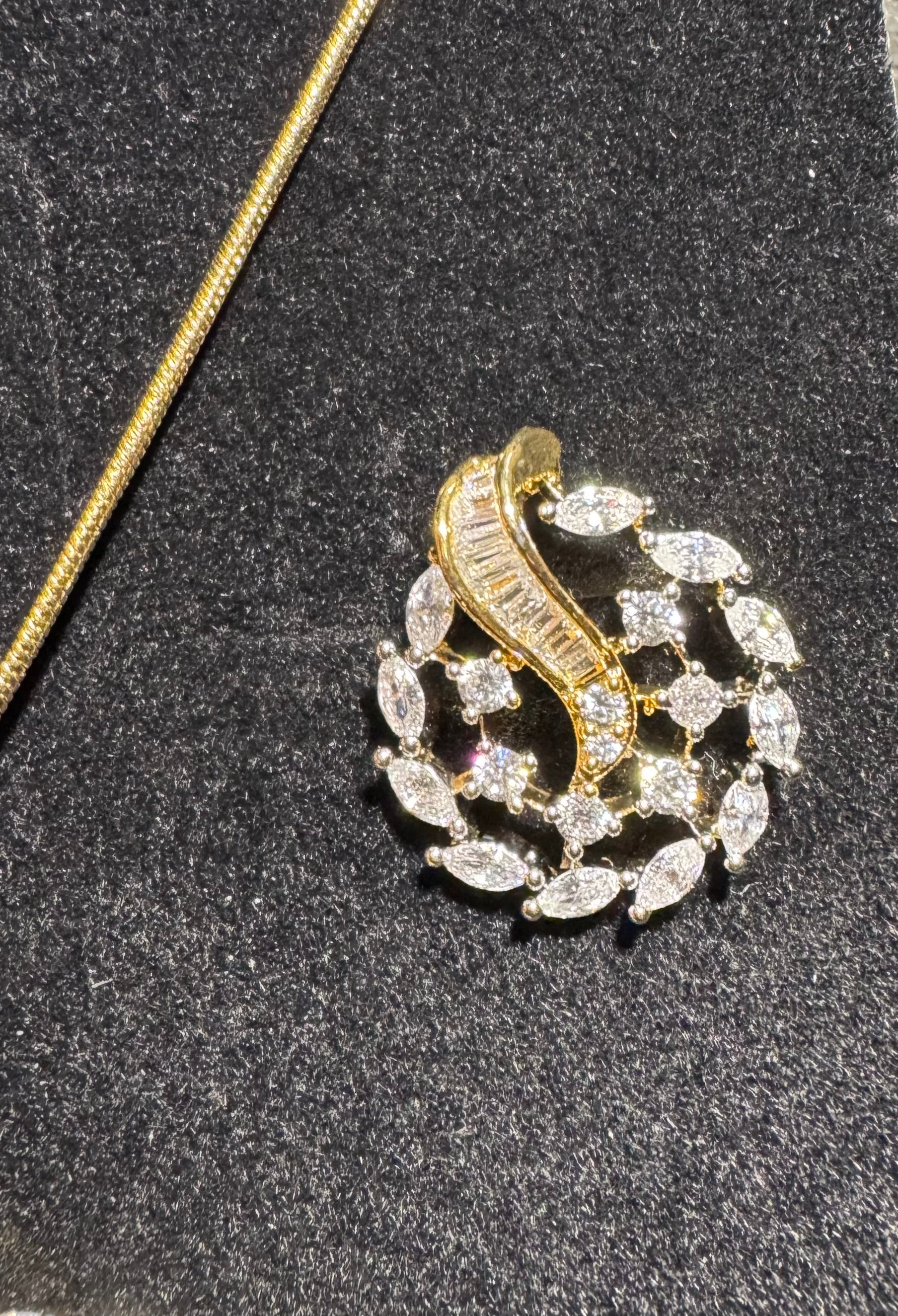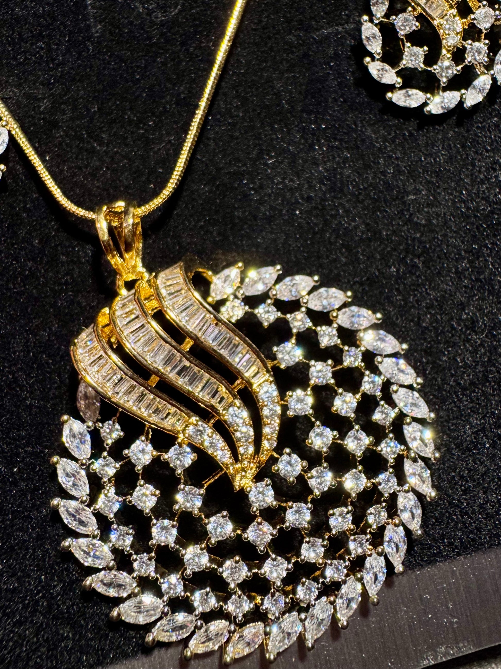 Make an unforgettable entrance with this luxurious two-piece set. The bold, circular pendant features a dazzling web of brilliant marquise-cut stones (leaf shape), framed by a unique border. A striking golden swirl of channel-set baguette-cut crystals sweeps across the top, creating dynamic movement and texture. The matching stud earrings mirror this exquisite design. Set in a warm gold tone, this jewelry is the ultimate statement piece for galas, weddings, or any occasion that calls for high-wattage glamour.
